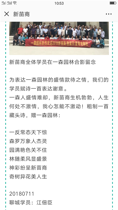下面附上新苗商學(xué)員的藏頭詩一首:感謝新苗商學(xué)員對(duì)一森園林的贊譽(yù)