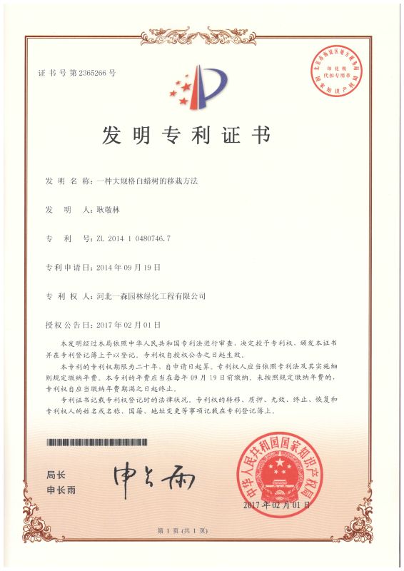 2017年2月1日,國(guó)家知識(shí)產(chǎn)權(quán)局頒發(fā)河北一森園林綠化工程股份有限公司“一種大規(guī)格白蠟樹(shù)的移栽方法”發(fā)明專利證書(shū),專利號(hào)ZL201410480746.7,證書(shū)號(hào)2365266。本發(fā)明專利涉及樹(shù)木的移栽技術(shù)領(lǐng)域,移栽成活率高,投資少,簡(jiǎn)單易行,效果好,效益高。在園林綠化工程中作用突出,好掌控,效果顯著。河北一森園林已建成全國(guó)知名的大規(guī)格白蠟基地,在本發(fā)明專利方法的指導(dǎo)下,大規(guī)格白蠟的移栽成活率高達(dá)95%。