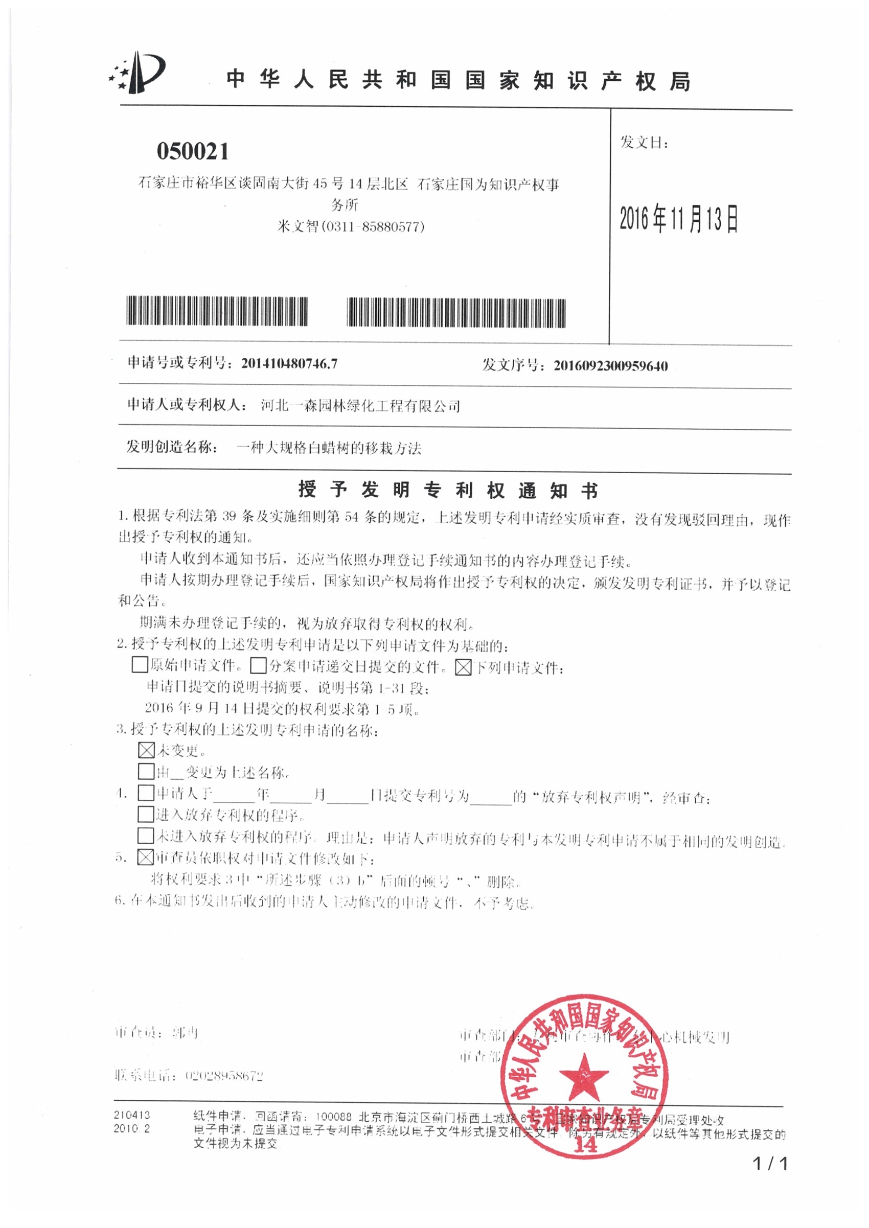 2016年11月13日,河北一森園林綠化工程股份有限公司收到國家知識產(chǎn)權(quán)局關(guān)于一森園林“一種大規(guī)格白蠟樹的移栽方法”被授予發(fā)明專利的通知,專利號201410480746.7。本發(fā)明專利涉及樹木的移栽技術(shù)領(lǐng)域,移栽成活率高,投資少,簡單易行,效果好,效益高。在園林綠化工程中作用突出,好掌控,效果顯著。河北一森園林已建成全國知名的大規(guī)格白蠟基地,在本發(fā)明專利方法的指導(dǎo)下,大規(guī)格白蠟的移栽成活率高達(dá)95%。
